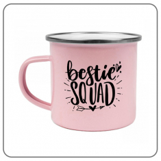 Tasse émaillée rose avec bordure argent, livrée dans sa boite en carton blanche.